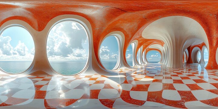 A vibrant 360 panorama studio space with reflections, ideal for business presentations, creative workshops, or promotional events, with copy space.