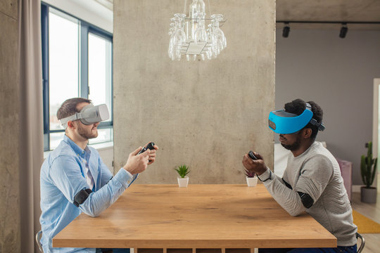 Senior african woman using virtual reality headset at home office - Technology business trend and lifestyle concept - Focus on vr goggles