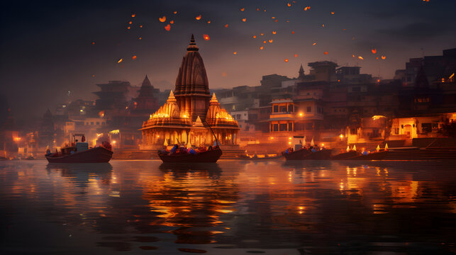 A hindu Vrindavan temple with beautiful lights and water generated by Ai