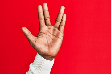 Arm and hand of african american black young man over red isolated background greeting doing vulcan salute, showing hand palm and fingers, freak culture