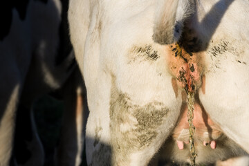 Urinating cow. Focus on the vulva and the yellow stream of urine