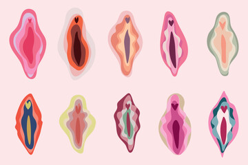 Pink soft fabric shaped as female genital organs, collection of different vulva shapes