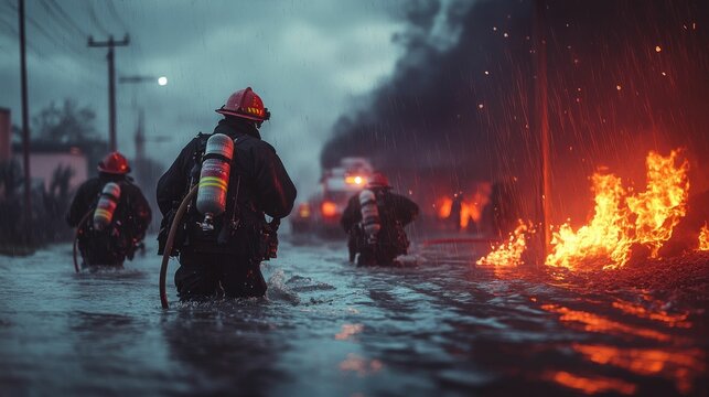 Firefighters wade through floodwaters, battling raging fire.