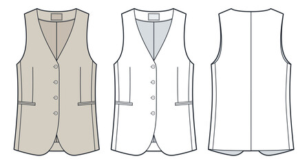 Women’s tailored button vest technical fashion flat, sleeveless waistcoat design, vector template, front and back view, CAD drawing flat vector illustration