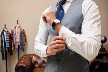 Man in gray waistcoat fastening shirt cuff in tailors boutique