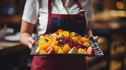 Waiter carrying appetizers on a plate on some festive event, Catering service.