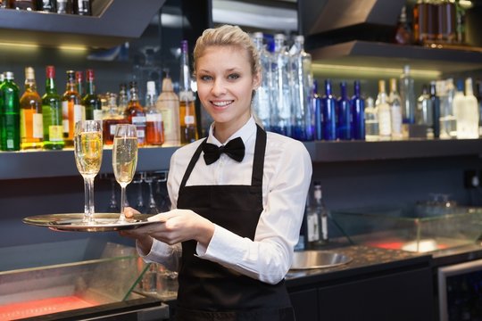 Pretty waitress holding a tray of champagne