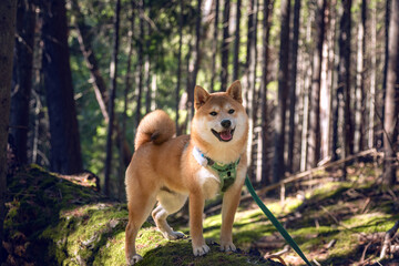 Cute 5 month old shiba inu puppy is standing on fallen mossy tree in the forest at sunny day.