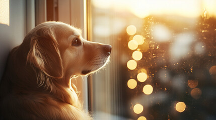 A heartwarming close-up of a dog sitting by a window. Dreamy and peaceful mood. Warm neutral tones, high-resolution pet portrait, soft-focus elegance