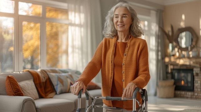 Senior woman using a walker in a cozy living room, soft sunlight through windows, warm and inviting atmosphere, isolated on white background, copy space