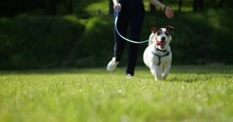 Walk the dog on the lawn. The dog runs on the green grass. On a leash walk with Jack Russell. A girl spends time with her pet in nature. The dog runs on the green grass.