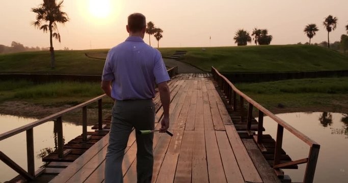 Professional golfer walking on the golf course. People, sport, leisure activity, recreation and lifestyle concept. Slow motion shot.