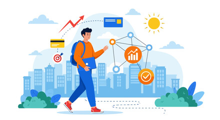 Vector art of young man with backpack walking in city, symbolizing business growth, financial planning, and career development with icons representing success and progress