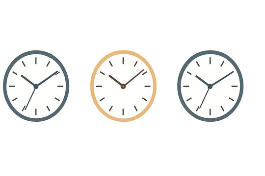 Set of wall clocks with black frame and hands. Flat style vector illustration. Simple classic wall clock with Arab numbers, with Roman numeral and without numbers isolated on white background