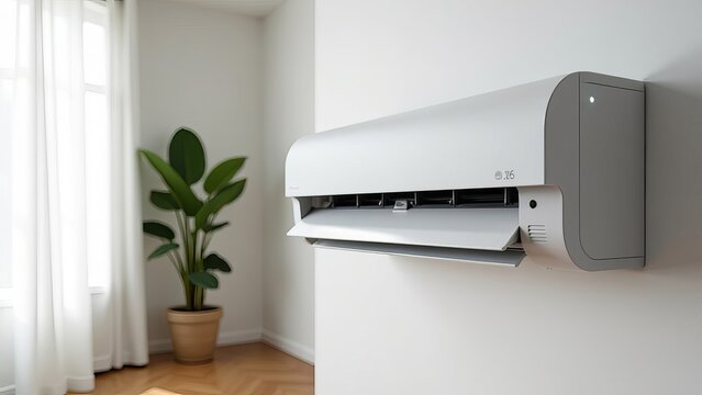 Modern indoor air conditioning unit mounted on a wall with its front panel open, revealing internal cooling components and fans, symbolizing home climate control