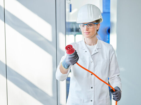 Electric plug and person interacting with a digital screen displaying a blue star. Ideal for technology, energy, innovation, digital content, connectivity, sustainability, product evaluation. Simple