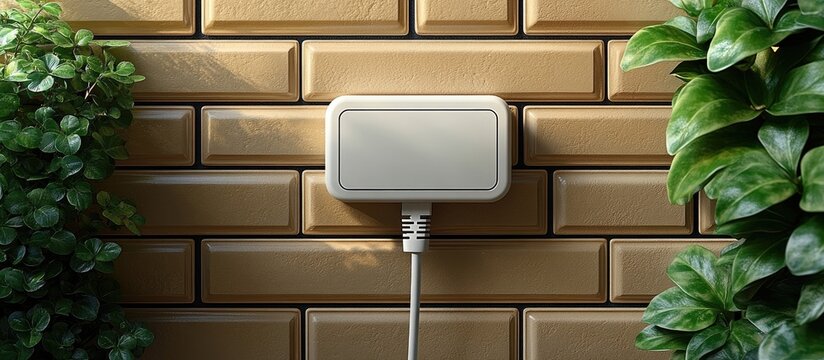 A white electrical outlet mounted on a brown brick wall, with greenery on either side.