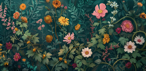 Graphic wildflowers are drawn on a dark background. Floral background.