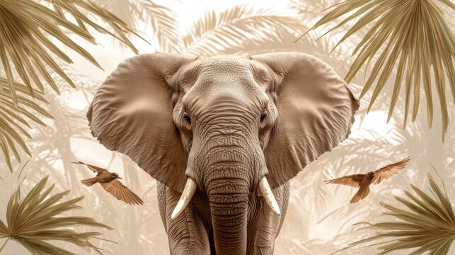 A black and white jungle animal wallpaper mural illustration depicts a tropical botanical landscape with palm trees, plants, elephants, and an elephant.