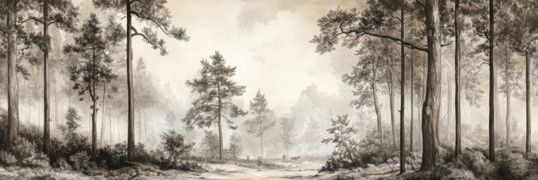 Enchanted Timberland: Vintage Watercolor Landscape of European Forest in Black and White