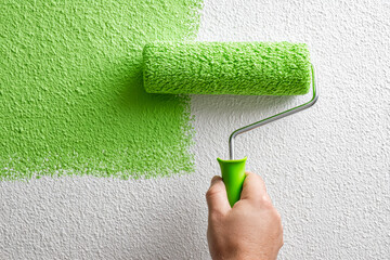 Close-up of a paint roller applying vibrant green paint to a textured wall.