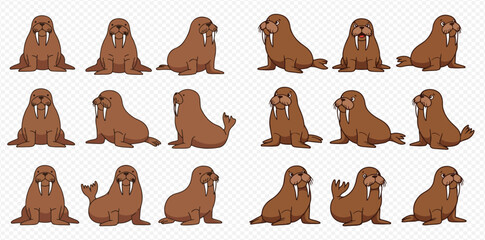 A set of brown cartoon walrus illustrations with large tusks, depicted in various poses and angles for an animation sequence.