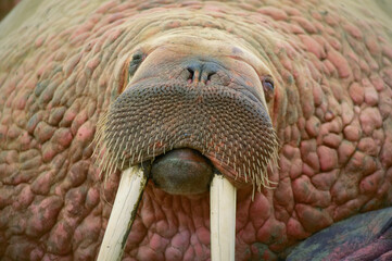 Close up of a walrus and tusks (Odobenus rosmarus) on the beach in Togiak National Wildlife Refuge; Alaska, United States of America