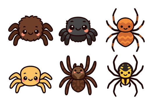 Cute spiders flat icon set. featuring brown, black, orange, yellow, and smiling cartoon spider symbols.