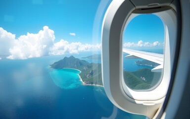 World Tourism Day Banner with Airplane Window Showing a Scenic Coastal Landscape. High quality