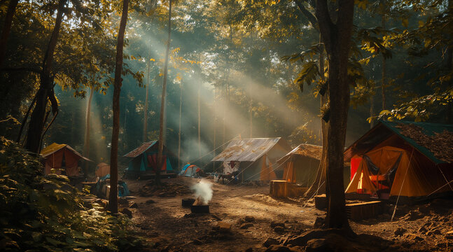 Sunlit Forest Camping Scene with Tents and Friends Enjoying Nature