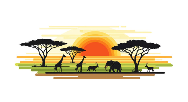 Savanna sunset silhouettes: a graphic illustration of African wildlife at dusk evoking wanderlust