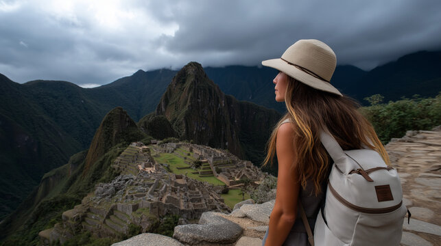 Tourist Woman with Hat and Backpack in London. Wanderlust concept.