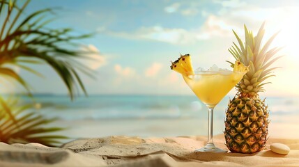 A close-up of a pineapple and a glass of cocktail on the beach. The cocktail is garnished with a pineapple wedge. The background is blurred.