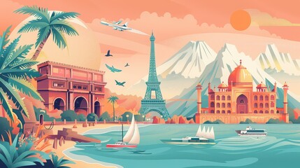 A retro travel poster design with soft colors and iconic landmarks, ideal for wanderlust shirts.