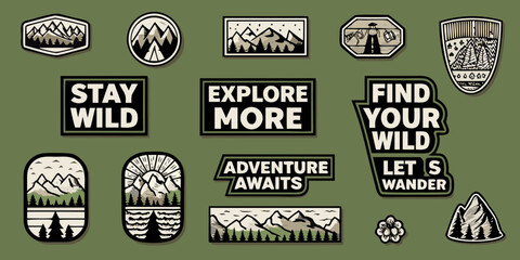 Collection of vintage adventure badges and stickers with mountain landscapes and inspirational quotes