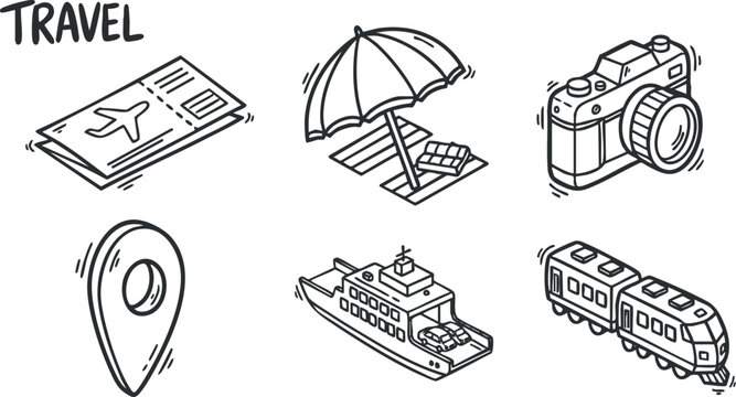 Collection of travel-themed vector icons featuring airplane, camera, ship, train, and map elements in a minimalist style