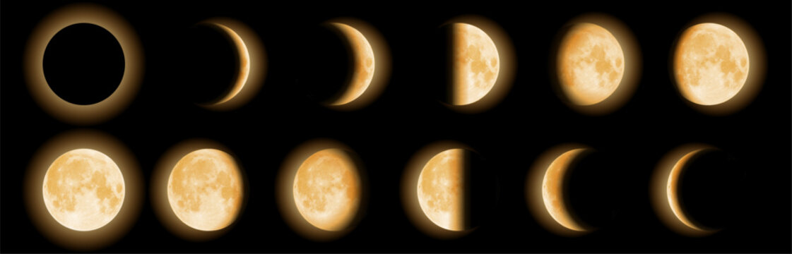 Crescent moon phases at night sky. Realistic 3d vector sequence frame shows the moon satellite varying shapes from eclipse, waning and waxing, to full moon. Natural lunar celestial astronomical cycle