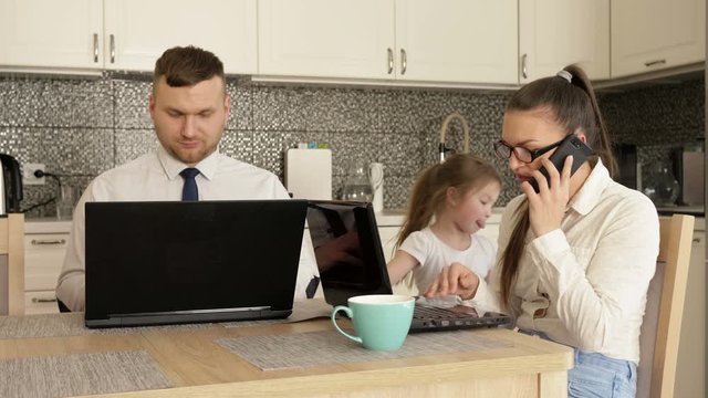 Young married couple is forced to work at home due to quarantine. Little daughter is bored, she wants to play, so she prevents her parents from working.