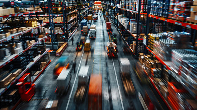 worker warehouse managing boxes in motion blur a distribution warehouse  conveyor belt stretching across the scene, lined with neatly arranged cardboard box packages