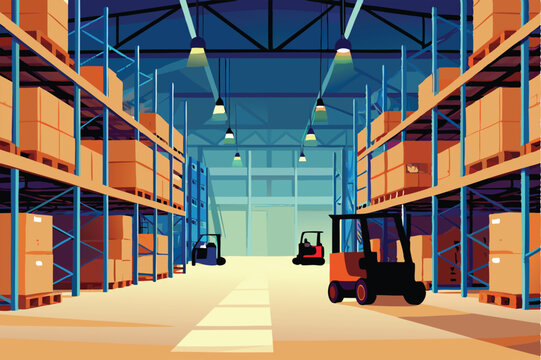 Early morning warehouse shift with workers preparing shipments under bright overhead lights, showcasing a productive and orderly work environment