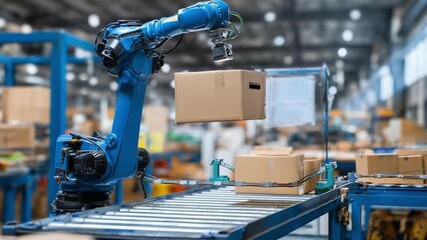 A blue robotic arm on a conveyor belt in a warehouse moves cardboard boxes.