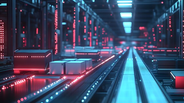 Futuristic warehouse with automated conveyor belts and glowing lights, showcasing advanced logistics and technology integration for efficient storage and processing of packages.