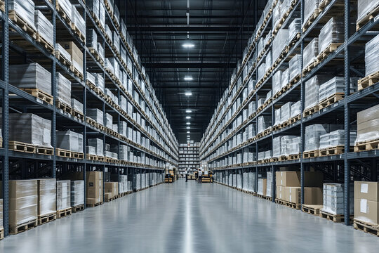 bustling warehouse scene featuring forklift operator navigating through stacks of boxes. atmosphere is dynamic and industrious, showcasing efficiency of warehouse operations