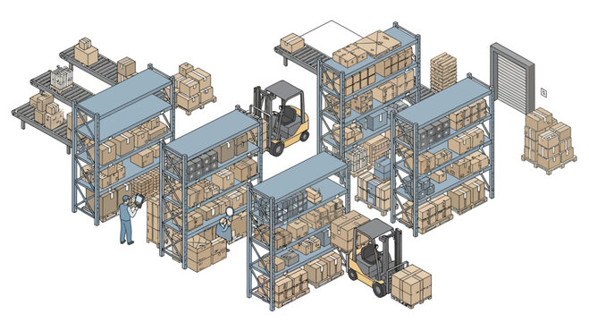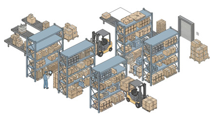 Efficient warehouse operations with forklifts and workers managing inventory, showcasing modern logistics and distribution solutions, optimized supply chain