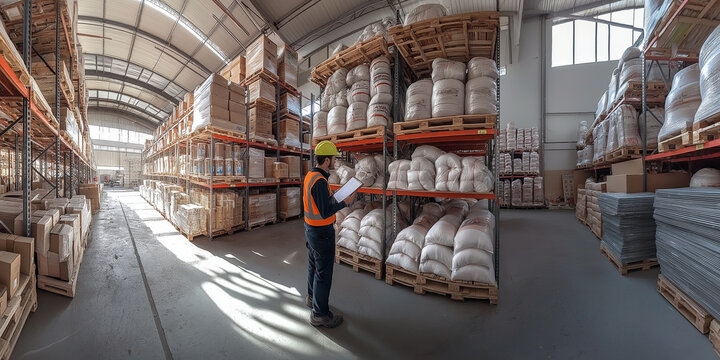 A warehouse for building supplies, worker inspecting inventory with a clipboard, shelves filled with pallets of cement bags, metal rods, and wooden boards, organized industrial space.
