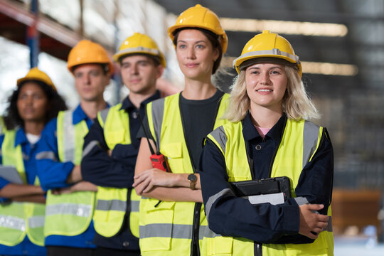 Group of warehouse workers standing with crossed arms in storage warehouse. Complete finish job. Successful of work concept