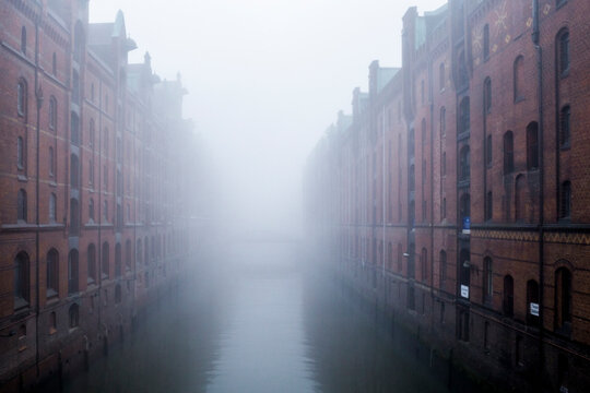 Germany, Hamburg, Speicherstadt, Old warehouses and canal in fog
