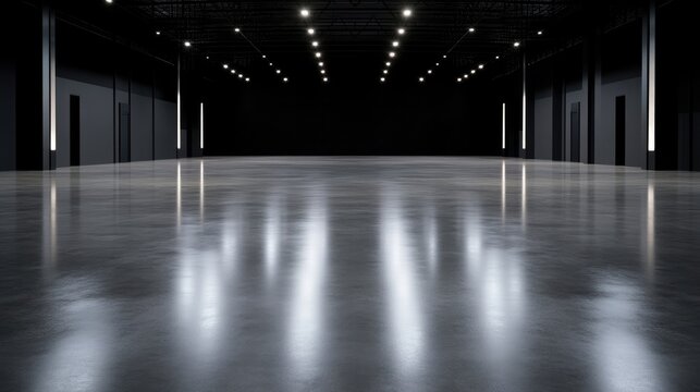 Empty, modern warehouse interior.  Glossy concrete floor reflects lighting.  Dark walls.  Professional studio setting