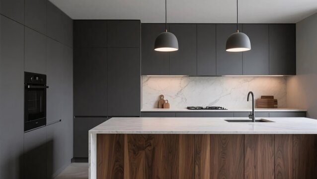 Charcoal grey minimalist kitchen with walnut cabinets and pendant lighting in warm ambiance