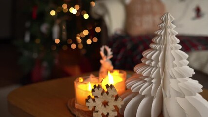 Christmas holiday decoration at home. Burning candles. Cozy atmosphere.